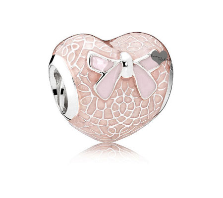 Следующий шарм необычно выделяется из общей коллекции. Кружевное луковое сердце. Сердце выполнено из эмали с розовым бантом в центре мягкого оттенка. Все сердце покрыто перепонками с эмалью персикового цвета.