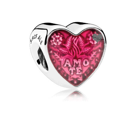 Очень интересный дизайн у шарма Latin Love Heart, Сердце с выгравированным рисунком и буквами Amo Te с залитой эмалью. Многие знакомы с испанскими словами Te Amo. А тут Пандора написала наоборот, это только подтверждает, то, что слова действительно написаны на латинском.